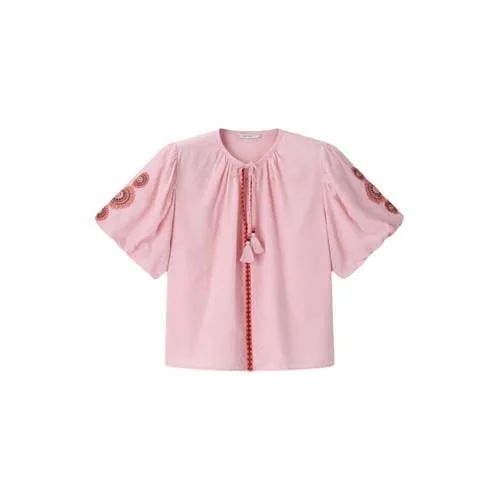 Lichtroze top met embroidery van Sissy-Boy. De top heeft korte pofmouwen, een ronde halslijn met geplooide details, speelse franjes en een regular fit. Verder heeft de top een lichtroze kleur met bloemen borduursels op de mouwen. Materiaal: 100% katoen.