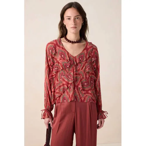 Rode ruffle blouse met print van Sissy-Boy. De blouse lange mouwen, een V-halslijn, ruffle details en een regular fit. Verder heeft de blouse een rode kleur met een all-over print met groene en donkerrode details. Daarnaast heeft de blouse ook glitter lurex details. Het model heeft een lengte van 1.77 meter en draagt maat S. Materiaal: 97% viscose, 3% metaal.
