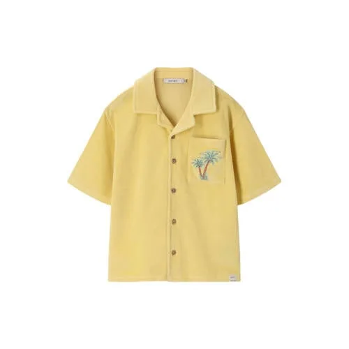 Lichtgele badstof overhemd van Sissy-Boy. Het overhemd heeft korte mouwen, een omgeslagen kraag, een knoopsluiting, één opgestikte zak en een regular fit. Verder heeft het overhemd een lichtgele kleur met een palmboom detail en een badstofkwaliteit. Materiaal: 100% katoen.