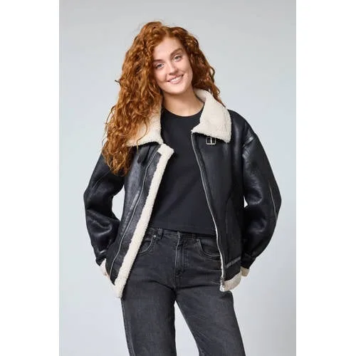 Deze jas van SisterS Point heeft een klassieke kraag en een ritssluiting. De jas is een bikerjack en gemaakt van teddy. Je vindt siergesp details en zijzakken, ideaal voor het winterseizoen.