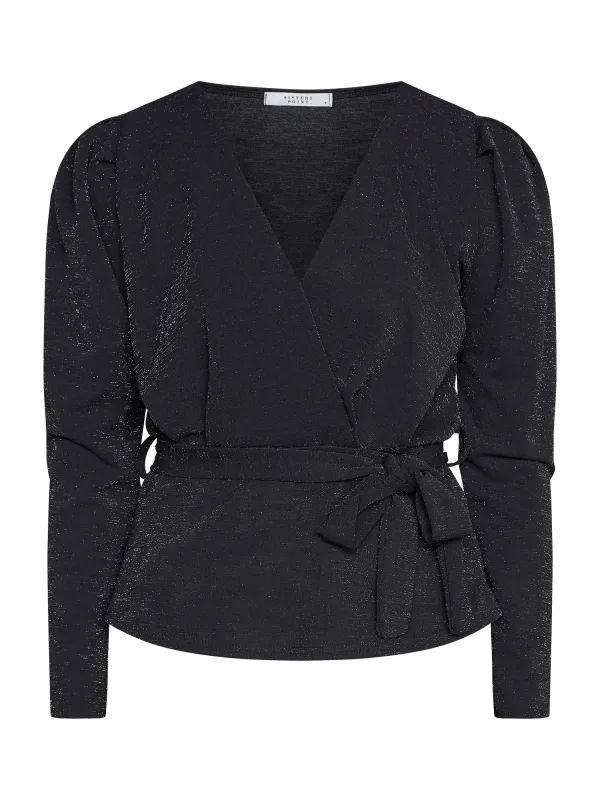 Blouse type: Blouseshirt; Design: Gevoerde zoom/rand, Rechte zoom, Pofmouwen, Tailleriem; Motief: Effen; Kraag: Zonder kraag; Details: Plooien, Gedrapeerd, Wikkel design; Extra's: Glitterend, Gladde stof, Riemlussen; Pasvorm: Normale pasvorm; Armlengte: Lange mouw; Lengte: Normale lengte