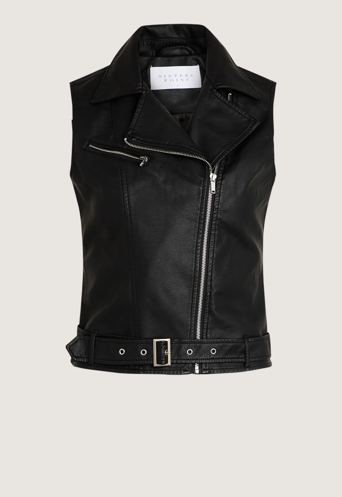 De 14088 Daza-ve Gilet heeft een effen zwarte kleur. De Gilet is gemaakt van non stretch vegan leather en heeft een schuine ritssluiting.