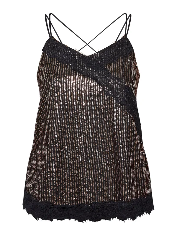 Design: Zoom/rand met boord, Wikkel-look; Materiaal: Jersey; Halstype: V-hals; Motief: Effen; Soort bandjes: Spaghettibandjes; Details: Pailletten, Kant; Extra's: Glinsterend, Op staal naden, Huidvriendelijk materiaal; Pasvorm: Normale pasvorm; Armlengte: Mouwloos; Lengte: Normale lengte
