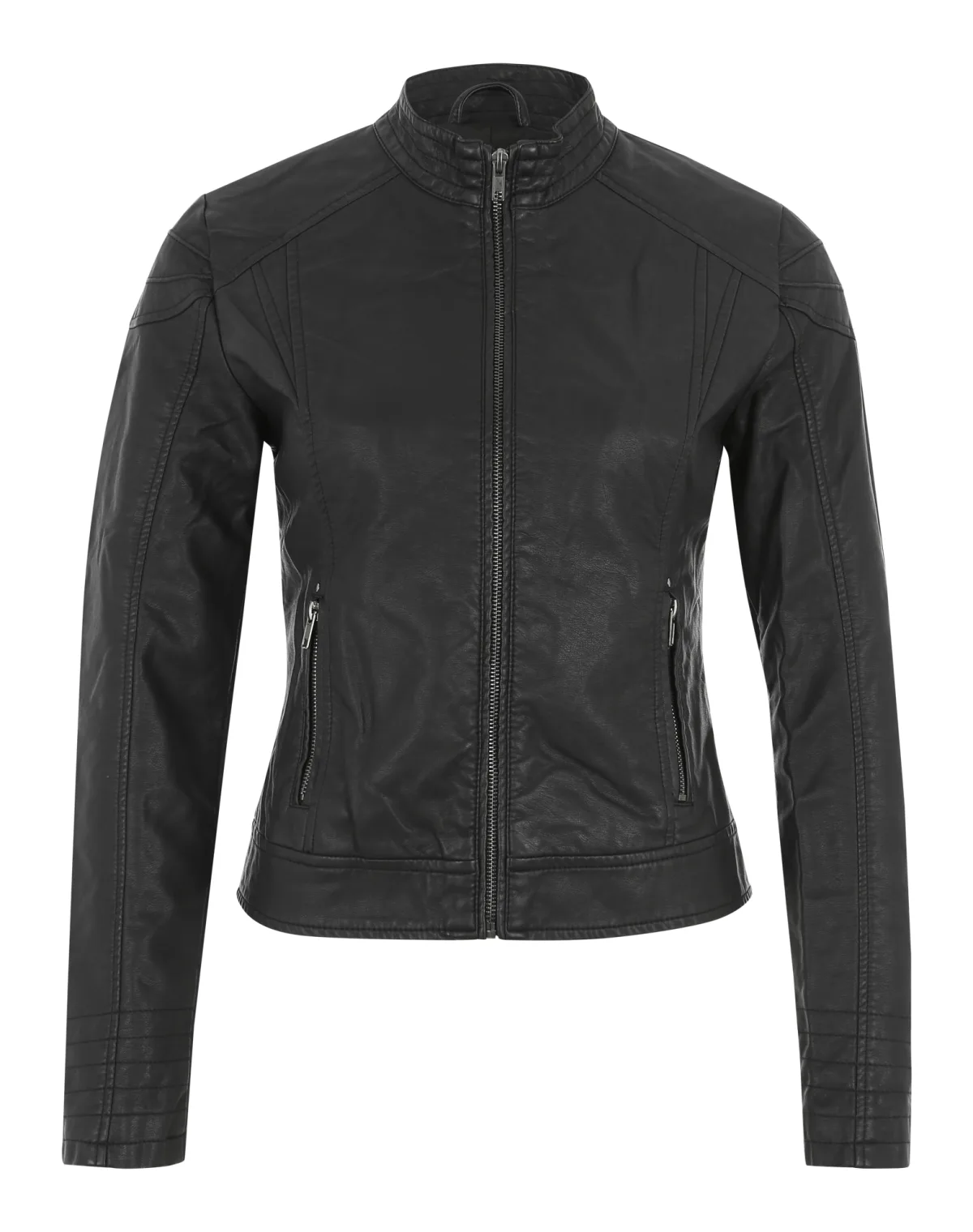 Design: Ritssluiting, Staande kraag, Getailleerd model, Ritszakken aan de zijkant; Type jas: Bikerjack; Voering: Licht gevoerd; Materiaal: Imitatieleder; Motief: Effen; Extra's: Stiksels; Pasvorm: Normale pasvorm