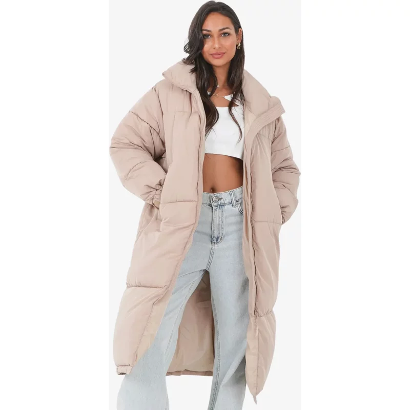 Sixth June lange dameswinterjas in de kleur beige. Heerlijk warm lang puffer model.
