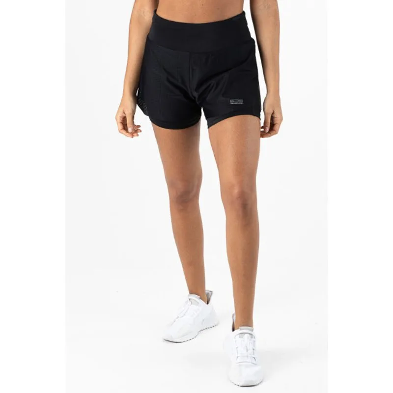 SJENG SPORTS PUCK HARDLOOPBROEK MET BINNEN TIGHT ZWART VOOR DAMES SJS Running short voor dames. Deze twee in één short bestaat uit een broek van multistretch materiaal, gecombineerd met een rokje van geperforeerde mechanische stretch. Hij heeft een powermesh zak voor je telefoon en een opbergzakje in de tailleband.