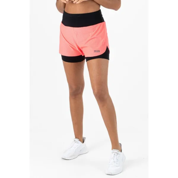 SJENG SPORTS KORTE HARDLOOPBROEK VOOR DAMES SJS Running short voor dames. Deze twee in één short bestaat uit een broek van multistretch materiaal, gecombineerd met een rokje van geperforeerde mechanische stretch. Hij heeft een powermesh zak voor je telefoon en een opbergzakje in de tailleband.