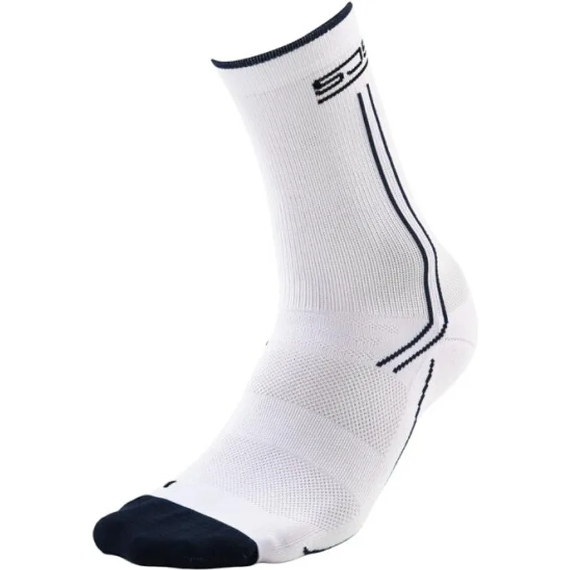 Sjeng Sports Sport Sokken Tom Donkerblauw De Sjeng Sports Tom sport sokken zijn vervaardigd van hoogwaardige materialen die zorgen voor een optimale combinatie van comfort en functionaliteit. De sokken zijn voorzien van een zachte, gewatteerde voetbed om vermoeidheid te verminderen en schokken te absorberen tijdens intense bewegingen. Dankzij de ergonomische pasvorm bieden de sport sokken een nauwsluitende ondersteuning die perfect aansluit op je voeten. Dit minimaliseert wrijving en voorkomt blaren, terwijl de verstevigde zones zorgen voor extra duurzaamheid en bescherming waar nodig. Pluspunten: + Deze sokken zijn wit met Donkerblauwe strepen langs de zijkant en langs de voet en ze hebben Donkerblauwe tenen en hielstukken + Ze zijn behandeld met Polygiene om ze lang fris te houden.