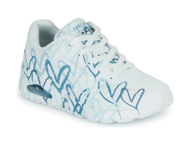 Skechers op onze webshop. Veterschoenen van het topmerk Skechers. Dit model maakt je outfit helemaal compleet. De fantastische hartjesprint maakt deze schoen helemaal af. Door de luchtkamer in de zool loop je heerlijk zacht op deze Skechers Uno Spread the Love. Deze schoenen van Skechers, artikelnummer 155507 Spread The Love WBL, bestel je gemakkelijk op onze webshop.