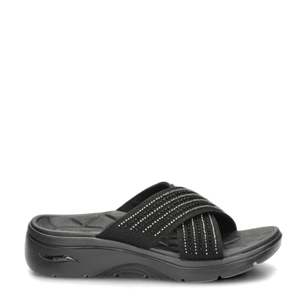 Skechers Arch Fit 2.0 Go Walk dames slipper Dankzij het neutrale kleurgebruik en de verfijnde details is deze wandelsandaal een veelzijdige toevoeging aan je zomergarderobe. De combinatie van sportieve prestaties en een stijlvolle afwerking maakt het een favoriet voor zowel wandelingen als terrasjes. De tussenzool is voorzien van lichtgewicht ULTRA GO-demping en Comfort Pillar-technologie die reageert op elke stap voor een verend gevoel. Deze technologieën werken samen om schokken effectief te absorberen en bieden een hoogwaardig loopcomfort gedurende de hele dag. Het bovenwerk is vervaardigd van een textiel voor meer comfort. De gekruiste banden zitten comfortabel om de voet. De subtiele rijen goudkleurige steentjes op de banden geven de sandaal een luxe en modieuze uitstraling die zowel casual als netjes gedragen kan worden. Deze sandaal is uitgerust met het innovatieve Skechers Arch Fit-voetbed, dat speciaal is ontworpen om de voetboog optimaal te ondersteunen. Dit ergonomische