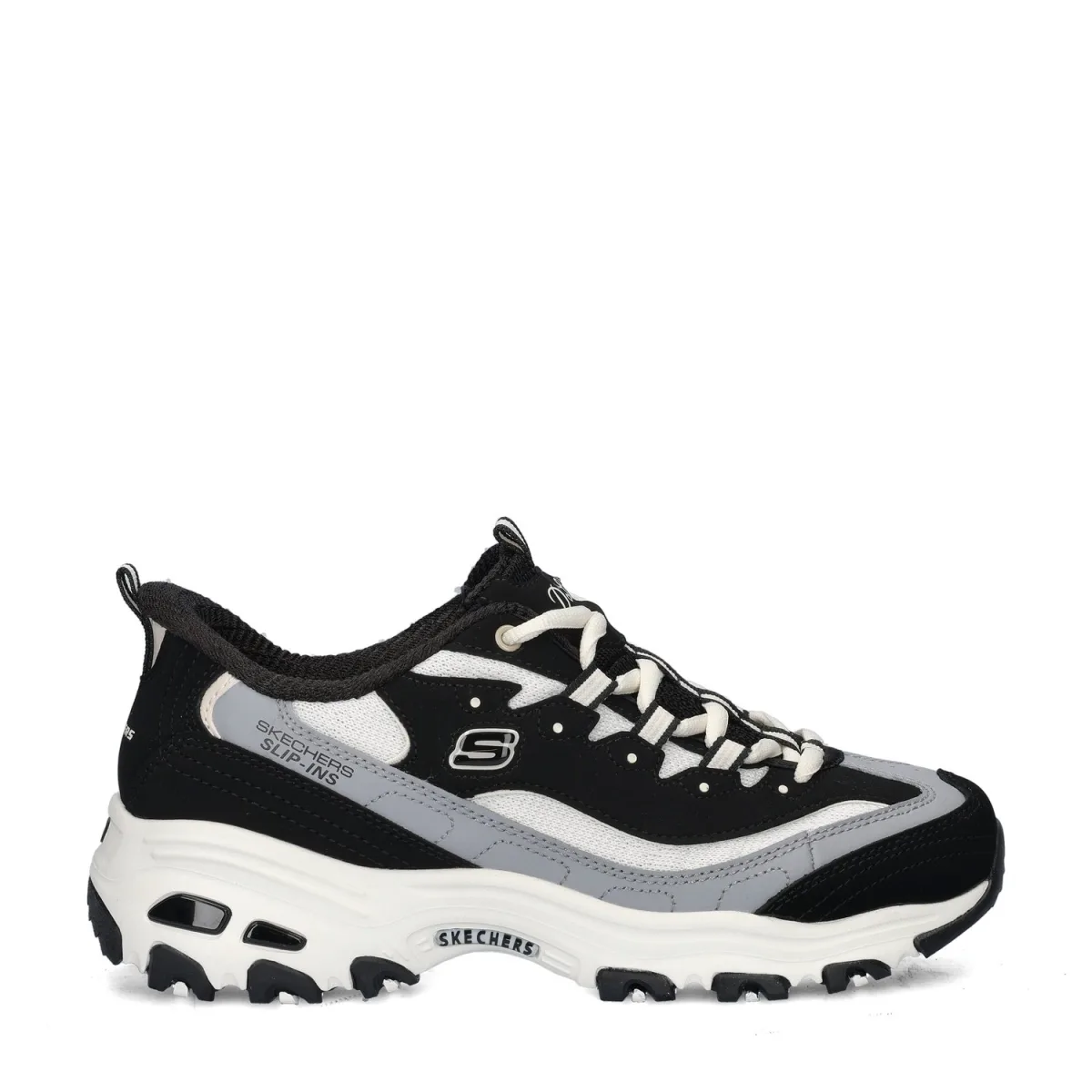 Skechers Hands Free Slip-Ins D'Lites dames sneaker De chunky D'Lites sneakers van Skecher zijn een echte musthave in jouw schoenencollectie. Met de innovatieve Hands Free Slip-In technologie trek je ze zonder handen en zonder bukken aan! Uitgevoerd in imitatieleer en textiel met leuke vetersluiting. Gevoerd met textiel wat zorgt voor meer comfort tijdens het lopen. Dankzij de ingebouwde schoenlepel en Heel Pillow-technologie wordt de Hands Free Slip-In feature mogelijk gemaakt. Bevat een Air-Cooled memoryfoam voetbed die naast optimale demping ook een goede vochtafvoer biedt en de voeten droog en fris houdt. Afgewerkt met een chunky loopzool met grof profiel voor betere grip en stabiliteit.