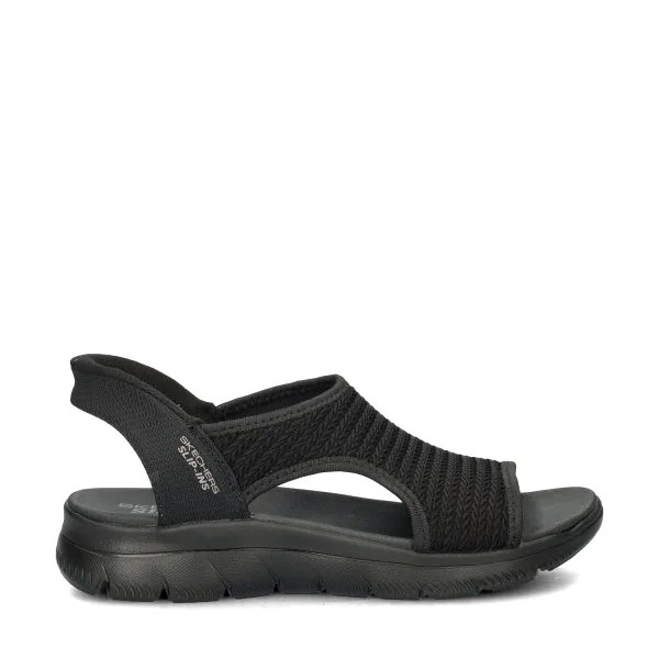 Skechers Hands Free Slip-Ins Summits dames sandaal De Hands Free Slip-Ins is natuurlijk ook voor sandalen super handig. Uitgevoerd in rekbaar textiel wat een aansluitende pasvorm garandeert. De hielband is voorzien van een ingebouwde schoenlepel waardoor je hem zonder handen aan kunt trekken. Voorzien van een EVA-voetbed wat uitstekende demping biedt en lichte ondersteuning. Afgewerkt met een flexibele en shcokabsorberende loopzool.