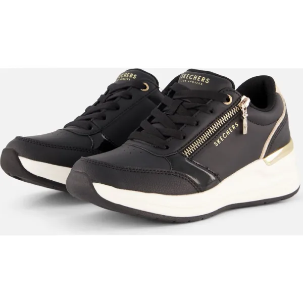 Deze Skechers Billion 2 High End sneakers in de kleur zwart met gouden details hebben een synthetisch bovenwerk, en zijn gemaakt van 100% vegan materialen. De tussenzool met sleehak heeft een flexibele buitenzool met grip. De comfortabele binnenzool is gemaakt van textielen materialen en de zool is gemaakt van rubber. De schoen is gemakkelijk aan te trekken door de veter- en ritssluiting.
