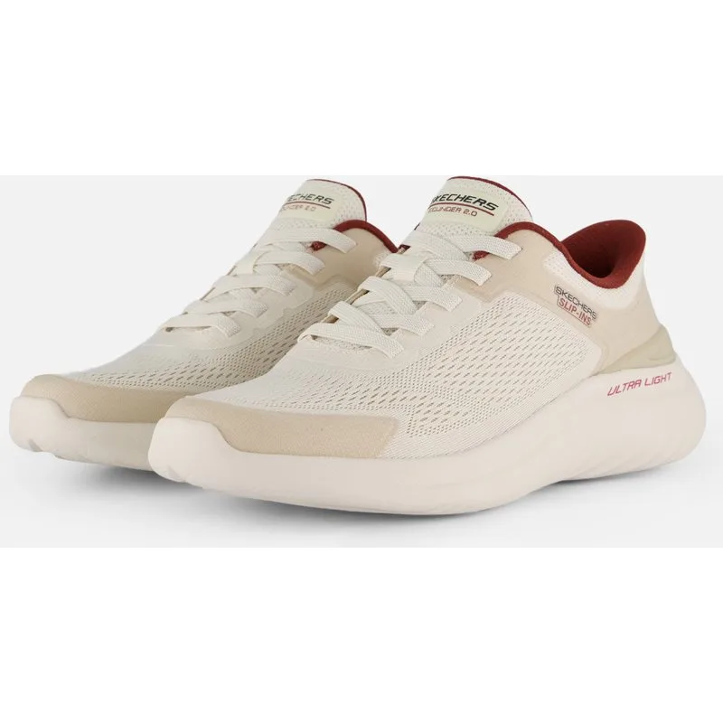 De Skechers Slip-in Bounder 2.0 instappers zijn sportieve herenschoenen in beige met donkerrode details die comfort en gemak perfect combineren. Dankzij het slimme Slip-in ontwerp stap je er moeiteloos in, terwijl het ademende mesh bovenwerk zorgt voor een lichte en prettige pasvorm. De donkerrode accenten bij de voering geven deze sneaker een stoere, eigentijdse uitstraling. Met de Air-Cooled Memory Foam binnenzool en de lichtgewicht, flexibele zool met grip geniet je de hele dag van optimale demping en comfort.