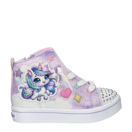 Deze Skechers sneaker heeft een buitenkant van imitatieleer en een voering van textiel. De rits- en vetersluiting zorgt voor makkelijk aan- en uittrekken, de platte zool biedt steun, glitters maken het speels.