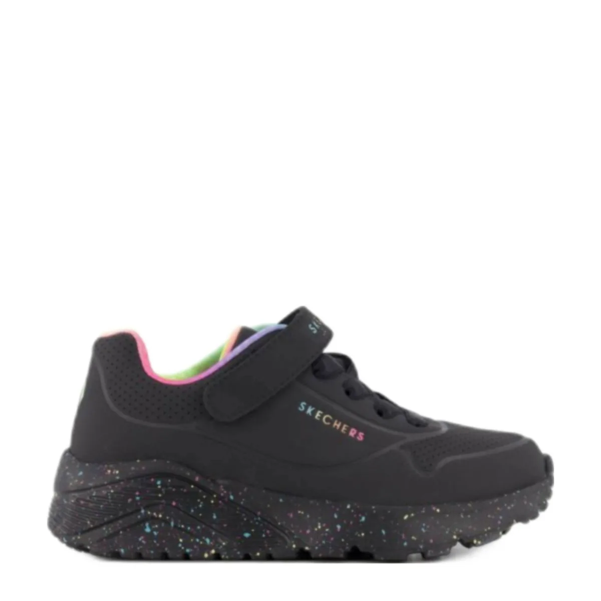 Deze Skechers Uno Lite Rainbow Specks Sneakers zijn voor Meisjes in de kleur Zwart. De schoenen zijn gemaakt van het materiaal Kunstleer en de voering is gemaakt van . De voetbreedte van de schoenen is G - normaal.