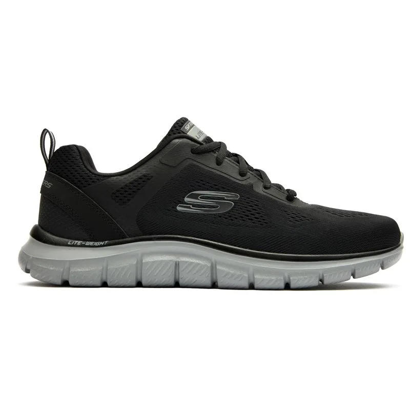 Zwarte Skechers track bredere trainers voor heren, gemaakt van textiel en een rubberen zool. Met: lichtgewicht zool, hiellus, memory foam binnenzool en machinewasbaar.