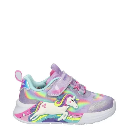 Deze Skechers Unicorn Chaser sneaker voor meisjes heeft een buitenkant van textiel en imitatieleer. De sneaker heeft een elastische veter- met klittenbandsluiting en een platte zool. Met lichtjes in de schoen voor extra plezier.