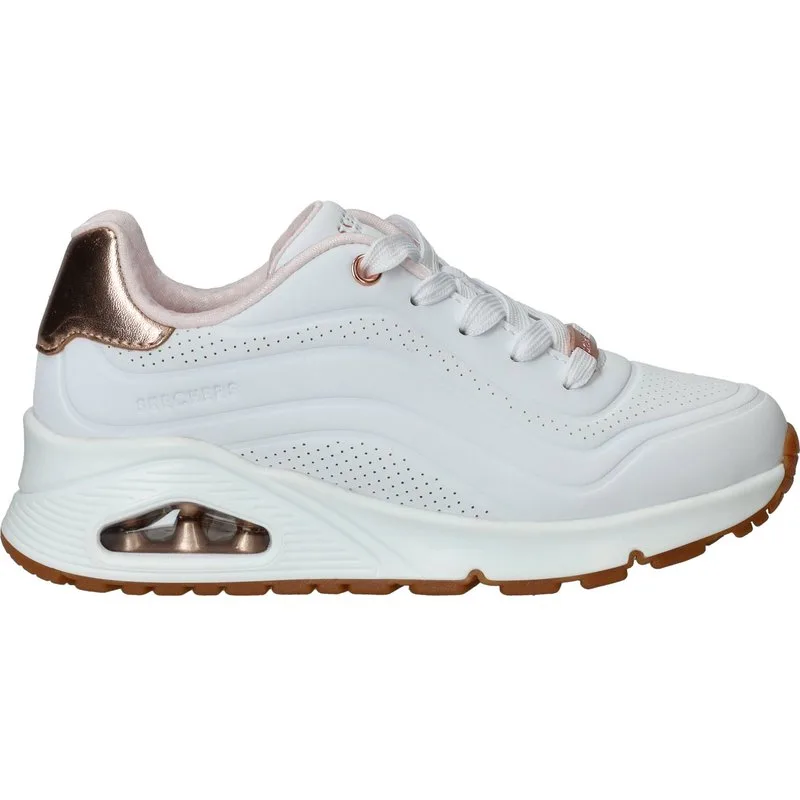Deze Skechers Uno Gen 1 Sneakers zijn voor Meisjes in de kleur Wit. De schoenen zijn gemaakt van het materiaal Kunstleer en de voering is gemaakt van . De voetbreedte van de schoenen is G - normaal.