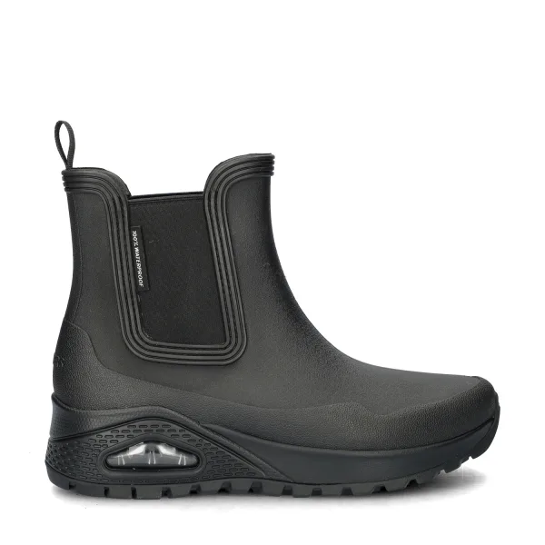 Skechers Uno Rugged dames chelseaboot Een stoere chelseaboot moet iedereen wel in zijn kast hebben staan. Deze van Skechers kun je zelfs als regenlaarsje gebruiken! Uitgevoerd in rubber met de kenmerkende elastische insets. Gevoerd met zacht textiel en licht gewatteerd voor een heerlijk comfortabel draaggevoel. Voorzien van een Skechers' memoryfoam-voetbed wat optimale demping biedt tijdens het lopen. Afgewerkt met een chunky zool met grof profiel wat je goede grip geeft. De Skech-Air tussenzool bidt de schokdemping die je van de Uno sneakers gewend bent.