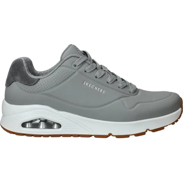 Deze Skechers Uno Suited On Air Sneakers zijn voor Heren in de kleur Grijs. De schoenen zijn gemaakt van het materiaal Kunstleer en de voering is gemaakt van . De voetbreedte van de schoenen is G - normaal.