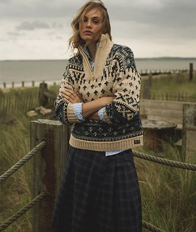 Vintage ET trendy. Warm en stijlvol, onze zip-up trui Ski Lodge is perfect met een spijkerbroek of legging om al je looks dit seizoen compleet te maken.Oversized pasvorm, overdreven en super casual zodat je stijl tot uiting kan komenHoge kraagZip-kraag tot een kwartGeribbelde manchetten en zoomLaat vallen schoudersHandtekeninglabel op de zoom