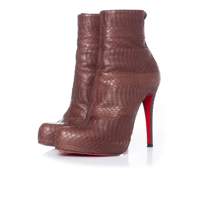 VINTAGE, RRP ALS NIEUW Christian Louboutin, slangenleren platformlaarzen in bruin. Het artikel is één keer gedragen en verkeert in zeer goede staat. Wordt geleverd met een stofzak. • TOESTAND: zeer goede staat • MAAT: 38 • INLEGMAAT: 25 cm • HIELMAAT: 12 cm PLATFORM: 2 cm • SCHACHTHOOGTE: 13 cm BOVENBREEDTE: 11 cm • STOFFEN: slangenleer • KLEUR: bruin