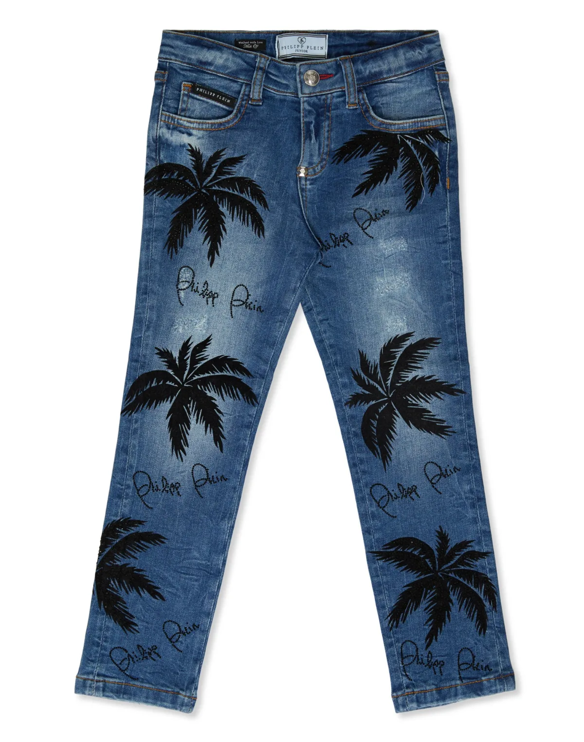 Hawaiian palm trees are this summer's collection leitmotif. On these stretch stone washed denim 5 pockets pants they are printed all-over. Crystals embellish the decorations. Buttoning on waist. Raw edge bottom. Fit: Slim.