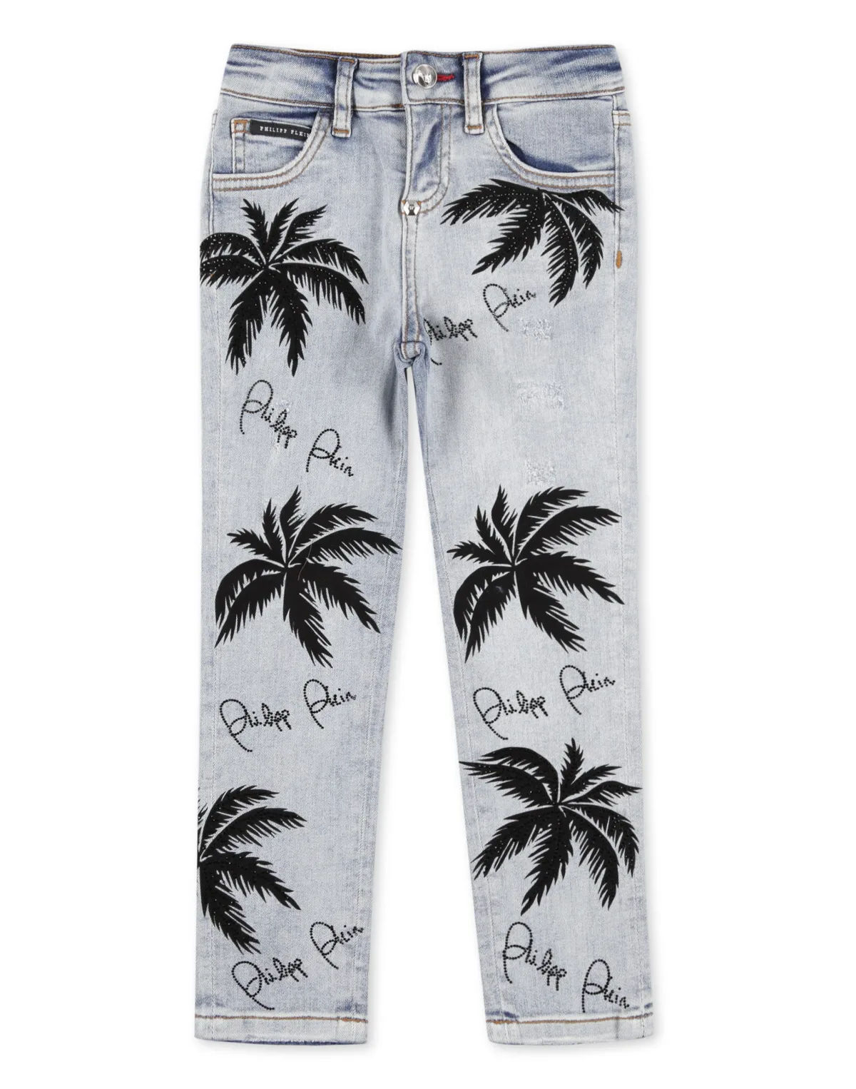 Hawaiian palm trees are this summer's collection leitmotif. On these stretch stone washed denim 5 pockets pants they are printed all-over. Crystals embellish the decorations. Buttoning on waist. Raw edge bottom. Fit: Slim.