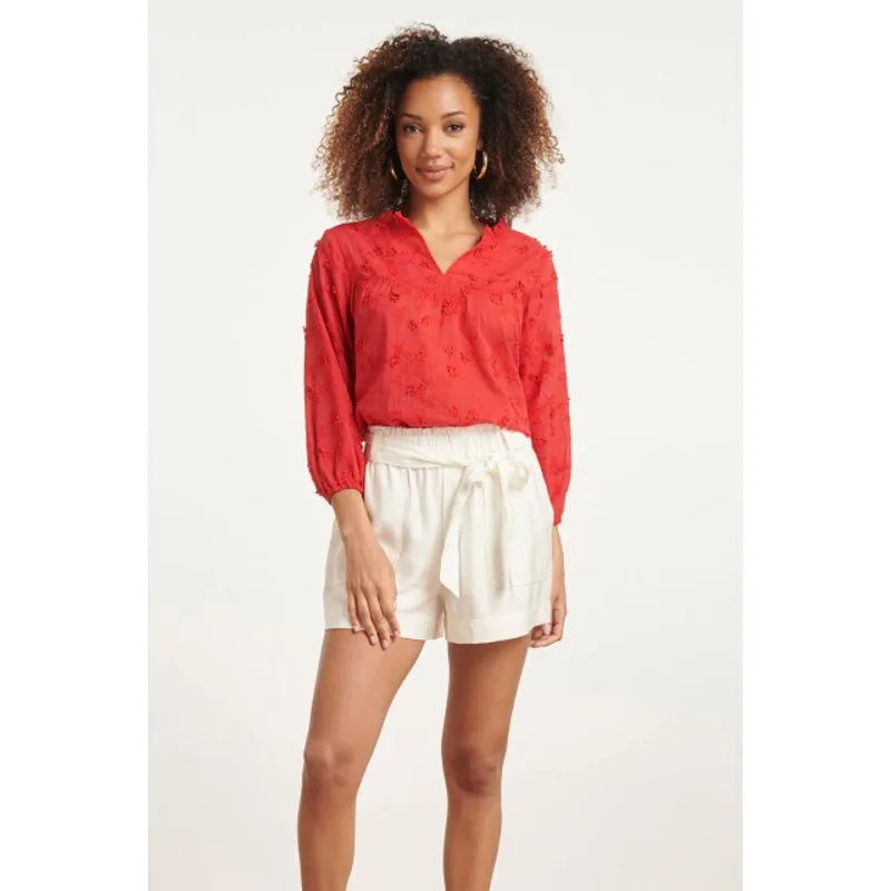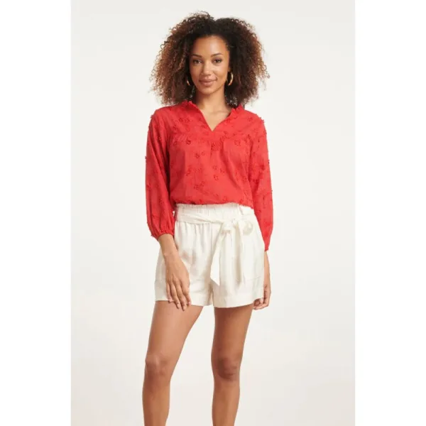 Ontdek de betoverende combinatie van passie en verfijning met de Smashed Lemon Rode Top met 3D Bloemenpatroon. Deze top belichaamt de essentie van moderne vrouwelijkheid, waardoor je zelfverzekerdheid en stijl in het middelpunt staan. Met een V-halsontwerp en een geruwde kraag straalt deze top elegantie uit, terwijl de 3/4 puffy mouwen en de insert panelen op de borst een opvallende dimensie toevoegen. Het unieke 3D bloemenpatroon creëert een levendige en speelse uitstraling, waardoor deze top perfect is voor elke gelegenheid. Gemaakt van hoogwaardig 100% katoen, biedt deze top niet alleen comfort, maar ook ademend vermogen voor een moeiteloze stijl, zelfs op warme dagen. Combineer het met je favoriete jeans of een rok voor een verfijnde look die je onderscheidt. Kenmerken: - Elegant V-halsontwerp met geruwde kraag voor een verfijnde uitstraling - 3/4 puffy mouwen en insert panelen op de borst voor extra dimensie - Uniek 3D bloemenpatroon voor een speelse en levendige touch