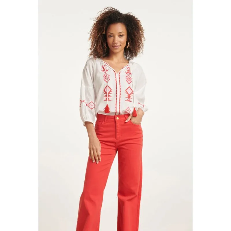 Voeg een vleugje bohemien chic toe aan je garderobe met de Smashed Lemon Ademende Witte Top met Tribal Borduurwerk. Deze prachtige top combineert stijl en comfort, waardoor het een must-have is voor je zomergarderobe. De ademende witte stof van 100% katoen zorgt ervoor dat je koel blijft op warme dagen, terwijl het opvallende tribal borduurwerk in de levendige kleuren rood en roze een uniek en trendy element toevoegt. De 3/4 volumineuze mouwen voegen een vleugje drama toe, waardoor deze top perfect is voor zowel dagelijkse looks als speciale gelegenheden. Het V-vormige decolleté met bijpassende rode kwasten voegt een speelse en vrouwelijke touch toe. De subtiele tassel-details zorgen voor een bohemien flair die deze top onderscheidt van de rest. Of je het nu combineert met je favoriete jeans, een rok of shorts, deze Smashed Lemon top is veelzijdig en stijlvol. Creëer moeiteloos een trendy en comfortabele look met dit ademende stuk dat je zomeroutfits zal verheffen. Kenmerken : -