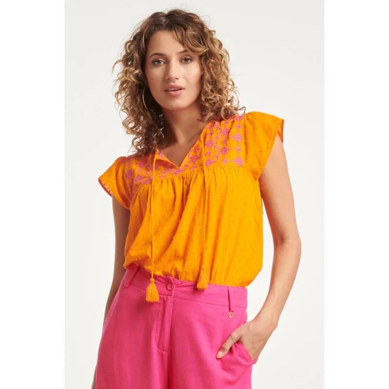 Voeg een dosis vreugde toe aan je zomergarderobe met de Smashed Lemon Vrolijke Oranje Korte Mouwen Top. Gemaakt van dobby stof , straalt deze top niet alleen frisheid uit, maar brengt ook een speelse elegantie met zich mee. Het opvallende fuchsia roze ornamental borduurwerk op het borstpaneel voegt een kunstzinnig accent toe aan deze levendige top. De korte mouwen en de kleine V-vormige halslijn met bijpassende oranje dobby stof voorzien van nekbanden en kwastjes, geven de top een bohemien en eigentijdse uitstraling. Gemaakt van 100% katoen biedt deze top niet alleen comfort, maar ook ademend vermogen op warme dagen. Of je nu naar het strand gaat, gaat winkelen of een informele bijeenkomst hebt, deze top is de perfecte metgezel voor een stijlvolle en comfortabele look. Laat je persoonlijkheid stralen met de vrolijke kleuren en het gedurfde ontwerp van de Smashed Lemon Oranje Korte Mouwen Top. Kenmerken: - Levendige oranje kleur en dobby stof voor een frisse uitstraling - Fuchsia
