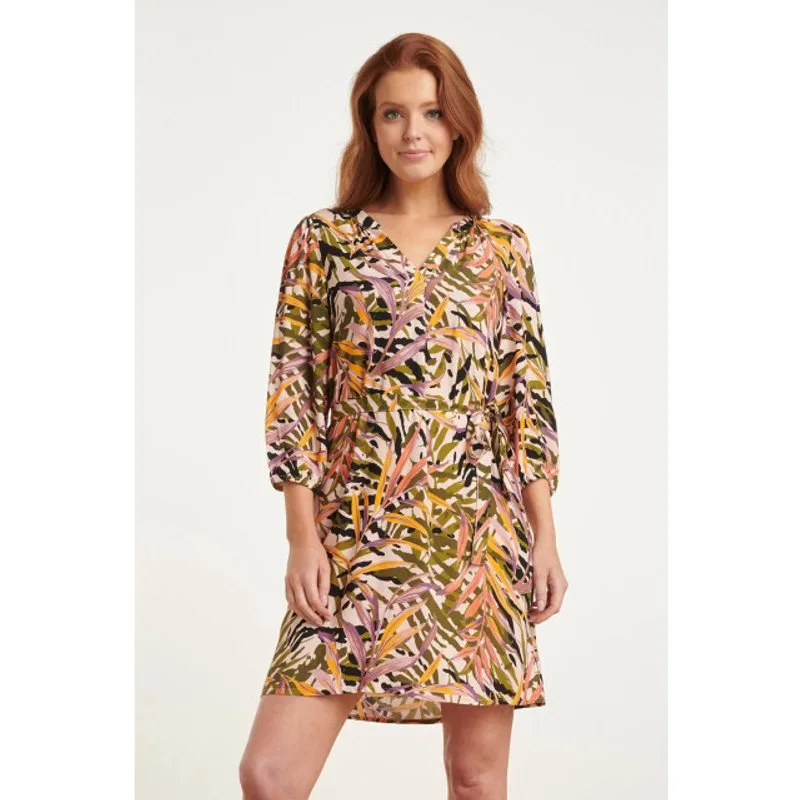 Voeg een vleugje speelsheid toe aan je zomerse look met onze Smashed Lemon zomerjurk met korte bladprint en pofmouwen. Deze stijlvolle jurk is ontworpen met een V-hals en 3/4-mouwen met ruches bij de halslijn rond de kleine kraagstandaard, wat zorgt voor een uniek en charmant accent. De jurk wordt geleverd met een bijpassende riem om de taille te accentueren en een flatterende pasvorm te creëren. Het heeft een allover bladprint in verschillende kleuren, waaronder roze, een vleugje oranje, en wat groen en zwart, wat een levendige en verfrissende uitstraling geeft. Gemaakt van hoogwaardig 100% viscose materiaal, biedt deze jurk comfort en ademend vermogen voor warme zomerdagen. Kenmerken: - V-hals ontwerp en pofmouwen voor een speelse uitstraling - Ruches bij de halslijn voor een charmant detail - Bijpassende riem voor een flatterende pasvorm Voeg deze Smashed Lemon zomerjurk met korte bladprint en pofmouwen toe aan je garderobe voor een trendy en vrouwelijke look deze