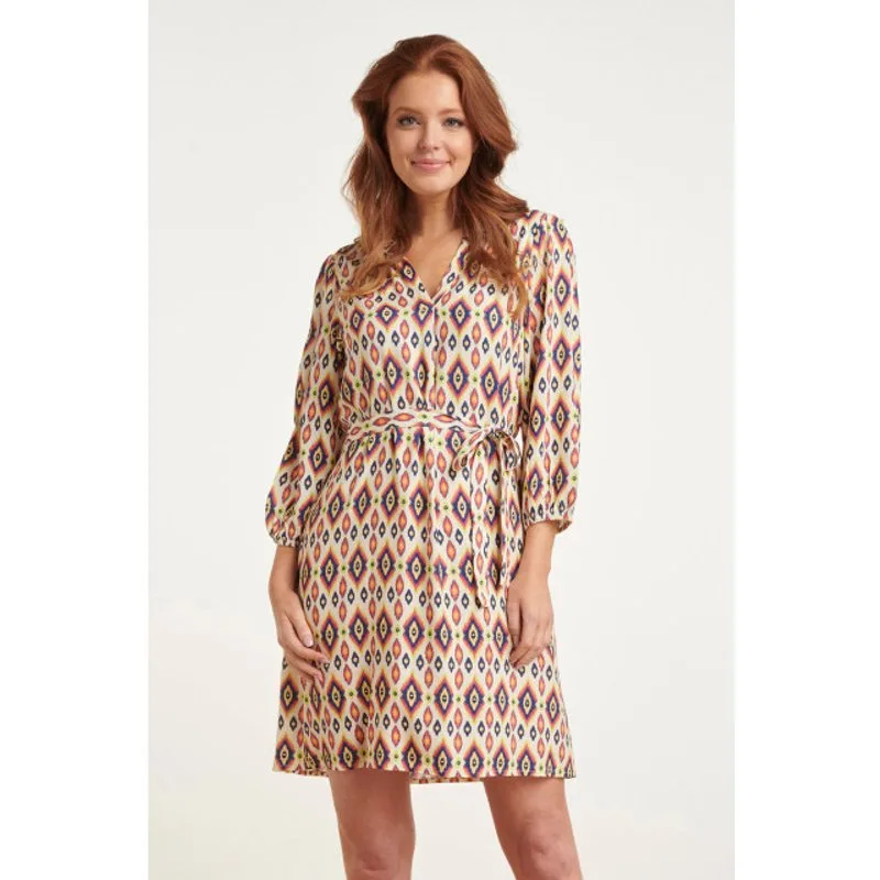 Voeg een vleugje kleur toe aan je zomerse garderobe met onze Smashed Lemon zomerjurk met pofmouwen en fel azteeks patroon. Deze stijlvolle jurk is ontworpen met een V-hals en 3/4-mouwen met ruches bij de halslijn voor een verfijnde touch. De jurk wordt geleverd met een riem om de taille te accentueren en een flatterende pasvorm te creëren. Met zijn levendige azteekse print in felle kleuren zoals limoengroen, blauw en oranje, is deze jurk een echte blikvanger. Gemaakt van 100% viscose, biedt deze jurk niet alleen comfort maar ook een lichte en luchtige feel, perfect voor warme zomerdagen. Of je nu naar het strand gaat, een zomerse lunch bijwoont of een avondje uit bent, deze jurk is een veelzijdige en trendy keuze die je look moeiteloos naar een hoger niveau tilt. Kenmerken: - V-hals en pofmouwen voor een trendy uitstraling - Levendig azteeks patroon met accenten van limoengroen, blauw en oranje - Inclusief riem om de taille te accentueren en een flatterende pasvorm te creëren Update
