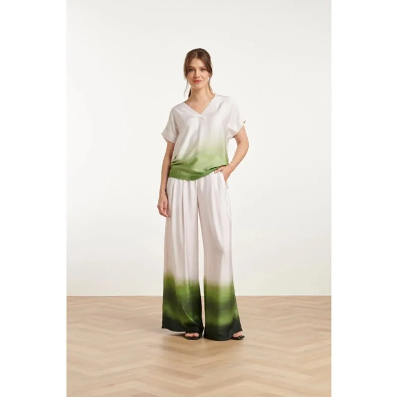 Laat je stijl stralen met de wide leg plissé broek van Smashed Lemon. Deze elegante broek is vervaardigd uit 100% rayon satijn en heeft een luxueuze, zijdezachte uitstraling. De opvallende ombre print, die verloopt van helder groen naar diep donkergroen en subtiel verdwijnt in off-white, geeft de broek een verfijnde en trendy look. Met twee sierlijke plooien aan elke zijde en een wijde pasvorm creëert deze broek een flatterend silhouet dat moeiteloos elegantie uitstraalt. Dankzij de echte knoop- en ritssluiting biedt de broek een klassieke afwerking en een comfortabele pasvorm. Bovendien is de broek volledig gevoerd met 100% viscose, wat zorgt voor ultiem draagcomfort en een soepele beweging. Belangrijkste kenmerken:- Stijlvolle wide leg pasvorm met elegante plissé details- Luxe 100% rayon satijnen stof met vloeiende ombre print- Comfortabele viscose voering voor een aangename pasvorm Draag deze statement piece met een effen blouse of een getailleerd topje voor een modieuze en chique