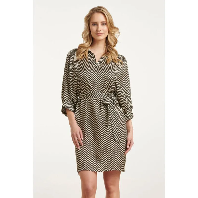 Maak een statement met de elegante en verfijnde Smashed Lemon damesjurk, ontworpen met een subtiele zwart-sand zigzagprint. Deze jurk heeft een stijlvolle v-hals met een kraag, gecombineerd met 3/4 pofmouwen die zijn afgewerkt met een echte manchet. De jurk is voorzien van een bijpassende riem, waardoor je jouw taille mooi accentueert. Het design stopt net boven de knie en de stof, bestaande uit 46% rayon en 54% viscose, geeft de jurk een luxe, satijnen uitstraling en een heerlijk zacht gevoel. Perfect voor zowel formele als informele gelegenheden, deze jurk biedt een tijdloze stijl die je met gemak kunt dragen. Belangrijkste kenmerken: - Subtiele zwart-sand zigzagprint - V-hals met kraag en 3/4 pofmouwen met manchet - Luxe satijnen look door de combinatie van rayon en viscose Voeg deze veelzijdige jurk toe aan je garderobe en creëer moeiteloos een chique en moderne look!Specificaties : * Stijl: jurken * Print: Grafisch * Pasvorm: Losvallend * Lengte: Boven de knie * Model