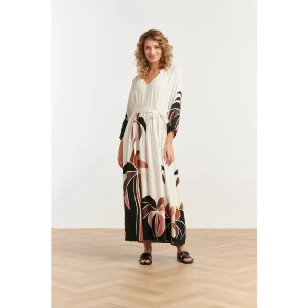 Smashed Lemon 25057 off white flowy maxi jurk met mauve palm print | Prijzen