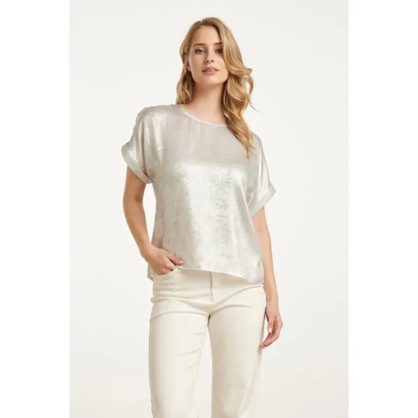 Voeg een vleugje glamour toe aan je garderobe met deze stijlvolle zilveren metallic top van Smashed Lemon. De top is ontworpen met een elegante ronde halslijn en korte mouwen met een trendy opgerolde afwerking. Dankzij de losse pasvorm biedt deze top ultiem draagcomfort en een flatterende uitstraling voor iedere gelegenheid. Draag het met een jeans voor een casual chique look of combineer het met een rok voor een feestelijke touch. Belangrijkste kenmerken:- Trendy metallic look – Perfect voor zowel een casual als feestelijke outfit- Comfortabele losse pasvorm – Stijlvol én aangenaam om te dragen- Hoogwaardige afwerking – Ronde hals en opgerolde korte mouwen voor een speelse touchSpecificaties : * Stijl: tops * Print: Uni * Pasvorm: Losvallend * Lengte: Kort * Model is : 176 cm tall and wears size S/36 * Country of Origin: Made in P.R.C. * Kleur: Zilver * Lining: No * Fabric composition: 100% polyester