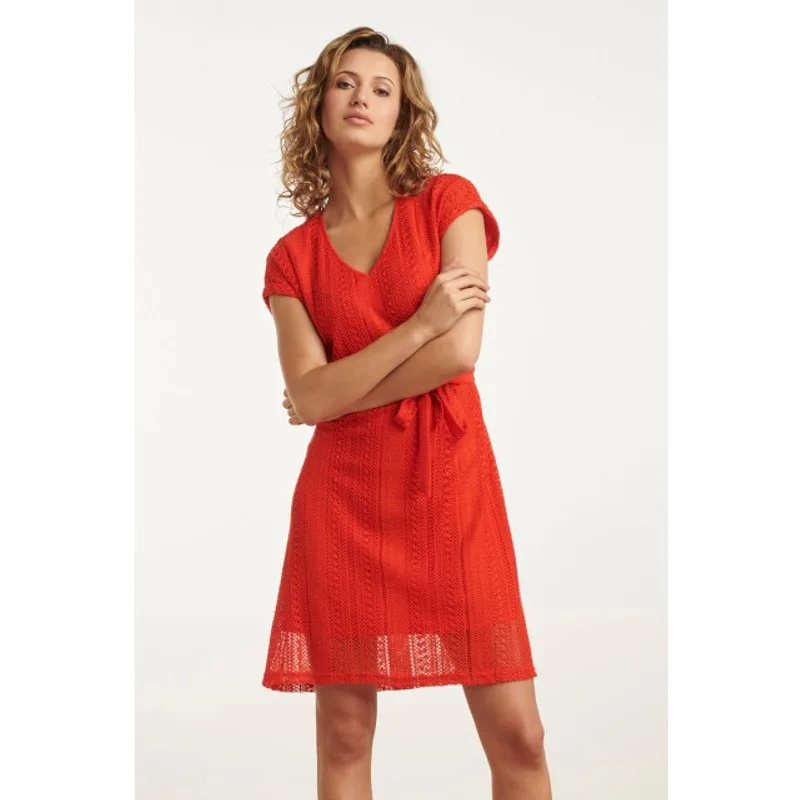 Deze prachtige Smashed Lemon Lacejurk in rood is de perfecte mix van elegantie en comfort. De jurk is ontworpen met een kantachtige stof die de natuurlijke schoonheid van het ontwerp benadrukt. De korte mouwen en de losse fit maken de jurk ideaal voor zowel informele als feestelijke gelegenheden. De V-halslijn voegt een verfijnde uitstraling toe, terwijl de bijpassende strikceintuur je taille subtiel accentueert. De jurk valt boven de knie en is volledig gevoerd voor extra comfort en een nette afwerking. Met zijn veelzijdige stijl kun je deze jurk zowel overdag als 's avonds dragen, en de opvallende rode kleur maakt hem een echte blikvanger. Het ontwerp van Smashed Lemon zorgt ervoor dat je altijd elegant en zelfverzekerd voor de dag komt. Belangrijkste kenmerken: - Valt boven de knie en is volledig gevoerd - Korte mouwen en een losvallende pasvorm - V-halslijn met bijpassende strikceintuur Specificaties : * Stijl: jurken * Print: Uni * Pasvorm: Losvallend * Lengte: Boven