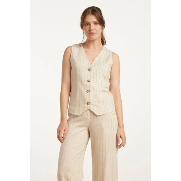 Deze stijlvolle Sandkleurige Gestreepte Linnen Waistcoat van Smashed Lemon is de perfecte aanvulling voor je zomergarderobe. Het lichte materiaal, bestaande uit 70% rayon en 30% linnen, biedt zowel comfort als ademend vermogen, terwijl het tegelijkertijd een elegante en verfijnde uitstraling heeft. De waistcoat is voorzien van een knoopsluiting en heeft een prachtig ontwerp met prinsessennaden, wat zorgt voor een getailleerde en vrouwelijke pasvorm. Met zijn tijdloze sandkleurige streepjespatroon is deze waistcoat veelzijdig te combineren met zowel casual als chique outfits. Draag hem op een lichte blouse voor een nette look of combineer hem met een eenvoudige top voor een relaxte stijl. De knopen aan de voorkant maken het eenvoudig om de waistcoat snel en gemakkelijk te sluiten, terwijl de princess seams zorgen voor een flattering fit die je figuur subtiel accentueert. Belangrijkste kenmerken: - 70% rayon en 30% linnen voor een ademende en lichte stof - Elegante prinsessennaden voor