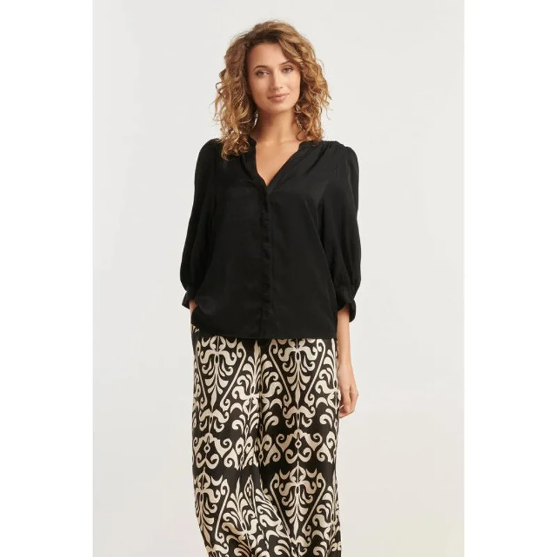 Deze elegante zwarte blouse van Smashed Lemon is een must-have voor elke modebewuste vrouw. Gemaakt van een luxe rayon satijnen stof, voelt deze blouse zijdezacht aan en geeft het een subtiele glans aan je outfit. De V-halslijn met onzichtbare knoopsluiting vanaf de borst tot de zoom zorgt voor een verfijnde uitstraling. De ¾ pofmouwen met brede manchetten voegen een speels, maar chique element toe. Perfect te combineren met zowel een nette broek als een casual jeans voor een veelzijdige look. Belangrijkste kenmerken: - Gemaakt van 58% rayon satijn: lichtgewicht, ademend en comfortabel - Elegante V-hals met subtiele knoopsluiting voor een verfijnde uitstraling - ¾ pofmouwen met brede manchetten voor een modieuze touch Maak je garderobe compleet met deze stijlvolle zwarte Smashed Lemon blouse!Specificaties : * Stijl: tops * Print: Uni * Pasvorm: losvallend * Lengte: kort * Model is : 175 cm tall and wears size S/36 * Country of Origin: Made in P.R.C. * Kleur: Zwart *