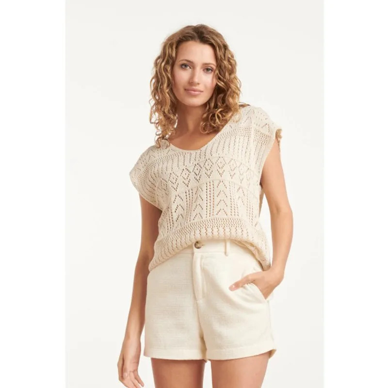 Deze elegante off-white crochet top van Smashed Lemon is een must-have voor je zomergarderobe. Het verfijnde breisel en de diepe, ronde halslijn geven de top een vrouwelijke en luchtige uitstraling. De korte mouwen zorgen voor extra comfort, terwijl het ademende materiaal van 50% katoen je de hele dag door een heerlijk draagcomfort biedt. Deze top is perfect te combineren met je favoriete jeans of een luchtige rok voor een speelse en stijlvolle look. Belangrijkste kenmerken: - Gemaakt van 50% katoen voor optimaal comfort - Diepe, ronde halslijn voor een vrouwelijke uitstraling - Korte mouwen voor een luchtige en zomerse look Voeg deze veelzijdige top toe aan je Smashed Lemon collectie en maak een statement met je stijlvolle, tijdloze outfit!Specificaties : * Stijl: tops * Print: Uni * Pasvorm: losvallend * Lengte: kort * Model is : 175 cm tall and wears size S/36 * Country of Origin: Made in Italy * Kleur: Wit * Lining: No * Fabric composition: 50%Cotton