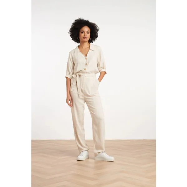 Deze elegante zandkleurige linnen jumpsuit van Smashed Lemon is een perfecte combinatie van stijl en comfort. Het luchtige design, gemaakt van 70% rayon en 30% linnen, biedt een heerlijk draagcomfort en een verfijnde uitstraling. De jumpsuit is ontworpen met een klassieke kraag en een V-halslijn, afgewerkt met knoopjes tot aan de taille voor een vrouwelijke touch. De ¾-lange pofmouwen voegen een speels en chic element toe, terwijl de elastische tailleband met bijpassende riem zorgt voor een mooi silhouet. De rechte, losvallende broekspijpen geven de jumpsuit een nonchalante, elegante look die perfect is voor zowel casual als geklede gelegenheden. Draag de jumpsuit met sandalen voor een zomerse look of combineer met hakken voor een stijlvolle avondoutfit. Belangrijkste kenmerken:- Luchtige en comfortabele stofmix van rayon en linnen- Elegante pasvorm met pofmouwen en rechte broekspijpen- Perfect voor zowel casual als chique gelegenheden Upgrade je garderobe met deze veelzijdige Smashed