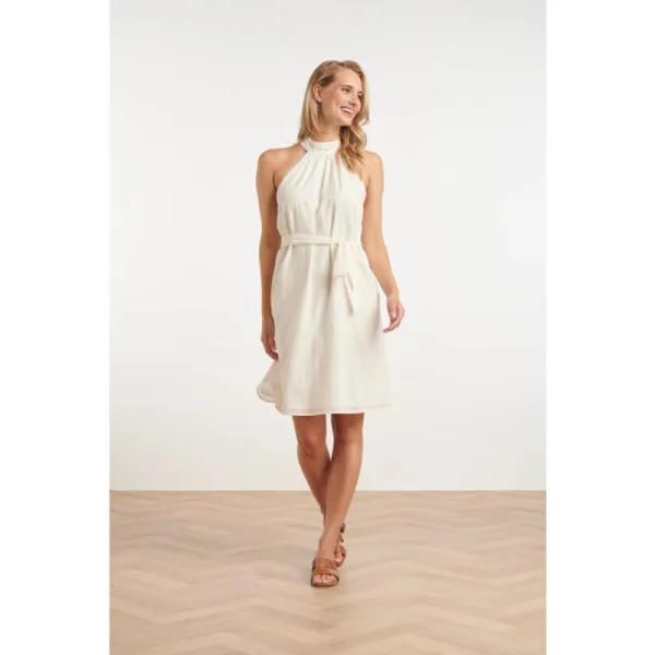 Voeg een vleugje elegantie en verfijning toe aan je garderobe met deze prachtige off-white halterjurk van Smashed Lemon. De jurk is ontworpen met een hoge hals die achter in de nek sluit met bedekte knoopjes, wat zorgt voor een chique en tijdloze uitstraling. De mouwloze halterstijl en de soepelvallende top geven de jurk een luchtige en vrouwelijke look. Dankzij de bijpassende ceintuur kun je je taille mooi accentueren voor een flatterend silhouet. De jurk heeft een speelse lengte die net boven de knie valt en is gemaakt van 100% katoen, waardoor hij heerlijk comfortabel draagt. Perfect voor een zomerse dag of een stijlvolle gelegenheid! Belangrijkste kenmerken: - Stijlvol & vrouwelijk – Elegante halterstijl met een losse pasvorm en bijpassende ceintuur - Luchtig & comfortabel – Gemaakt van 100% katoen voor een ademend draagcomfort - Veelzijdig te stylen – Ideaal voor zowel casual als chique gelegenheden Maak je look compleet met je favoriete sandalen of hakken en straal in deze