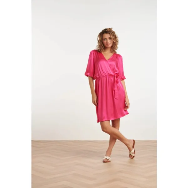 Voel je elegant en stijlvol in de Smashed Lemon fuchsia satijnen jurk. Deze prachtige jurk heeft een verfijnde V-vormige overlap halslijn die doorloopt tot de taille, met een speelse strik aan het einde van de overlap voor een vrouwelijk accent. De jurk heeft een elastische tailleband voor extra comfort en een flatterend silhouet. De 3/4 ballonmouwen geven de jurk een moderne en speelse uitstraling, terwijl de lengte die net boven de knie valt zorgt voor een verfijnde afwerking. Gemaakt van een luxe blend van 54% viscose en 46% rayon, voelt deze satijnen jurk zacht aan op de huid en valt prachtig. Of je nu een feestje hebt of een speciale gelegenheid, deze jurk is de perfecte keuze voor een stralende look. Belangrijkste kenmerken: - V-vormige overlap halslijn met strik bij de taille - Elastische tailleband voor een comfortabele pasvorm - 3/4 ballonmouwen voor een trendy uitstraling Met deze jurk maak je altijd een blijvende indruk!Specificaties : * Stijl: jurken * Print: uni *