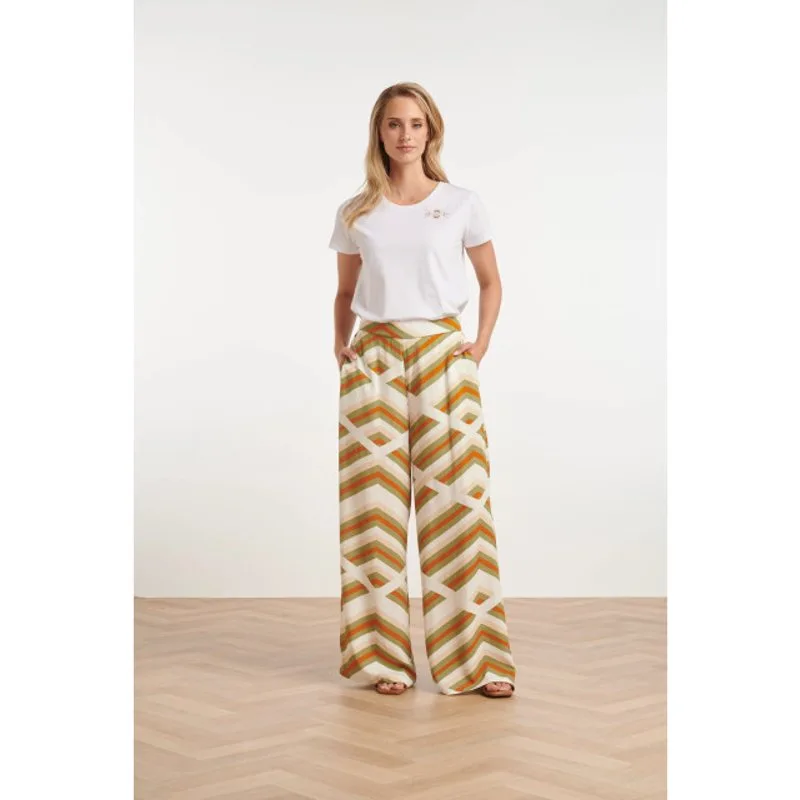 Op zoek naar een stijlvolle én comfortabele broek? De Smashed Lemon grafische gestreepte broek is een perfecte mix van mode en gemak. Dit trendy model heeft een wijd en vloeiend silhouet, waardoor het een elegante en moeiteloze uitstraling krijgt. De broek is ontworpen met een platte tailleband aan de voorkant voor een nette afwerking en een elastische tailleband aan de achterkant voor extra draagcomfort. De grafische streepprint in de kleuren off-white, bruin en army green geeft de broek een unieke en moderne look. Gemaakt van 100% rayon, voelt de stof heerlijk zacht aan en valt soepel om het lichaam. Perfect te combineren met een effen top of blouse voor een stijlvolle outfit! Belangrijkste kenmerken:- Wijdvallende broek met grafische streepprint- Comfortabele elastische tailleband aan de achterkant- Gemaakt van 100% rayon voor een soepele en lichte fitSpecificaties : * Stijl: broeken * Print: Strepen * Pasvorm: wijde pijpen * Lengte: Lang * 0 * Country of Origin: :
