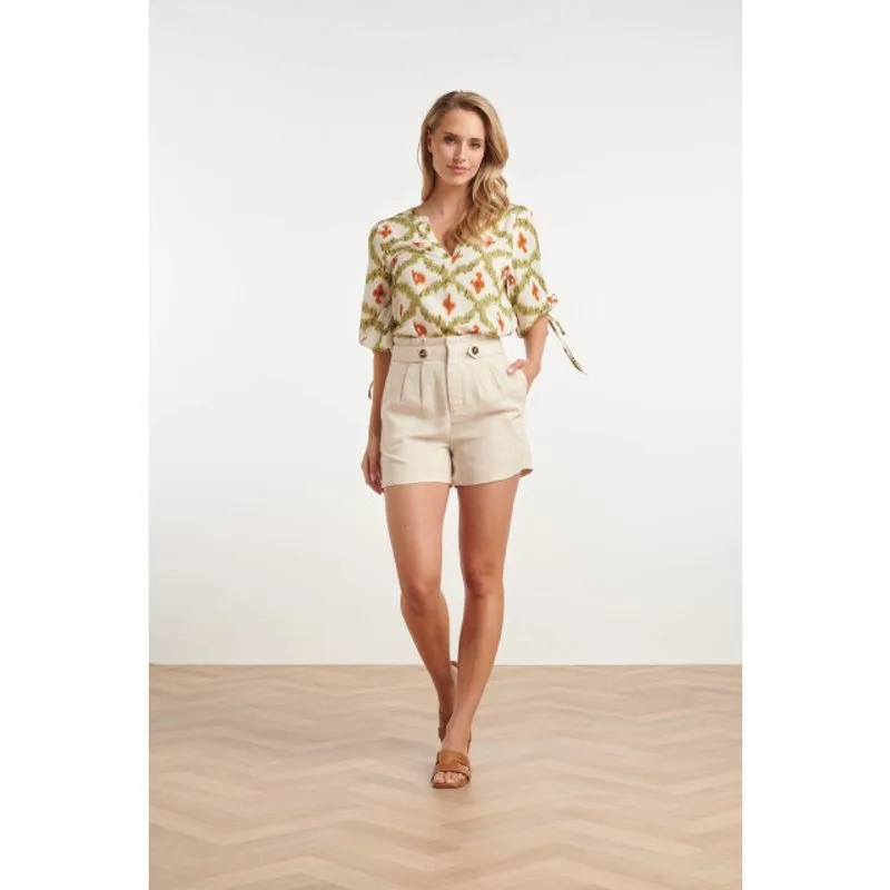 Geef je garderobe een stijlvolle update met deze prachtige Smashed Lemon top, perfect voor liefhebbers van bohemian chic. De top is uitgevoerd in een aards Aztec-patroon met tinten van legergroen en bruin op een zandkleurige achtergrond, wat zorgt voor een warme en natuurlijke uitstraling. De paneelvormige V-hals geeft het ontwerp een elegante touch, terwijl de 3/4-mouwen met strikdetails aan de manchetten een speels en verfijnd accent toevoegen. Dankzij de losse pasvorm valt de top soepel en comfortabel, ideaal voor zowel casual als geklede looks. Gemaakt van 100% rayon, voelt de stof heerlijk zacht en licht aan op de huid. Belangrijkste kenmerken:- Trendy Aztec-print in warme aardetinten- Comfortabele pasvorm met stijlvolle V-hals en strikdetails- Luchtige en zachte stof van 100% rayon Maak je outfit compleet door deze Smashed Lemon Aztec top te combineren met een jeans of een rok voor een moeiteloos chique uitstraling!Specificaties : * Stijl: tops * Print: Aztec * Pasvorm: