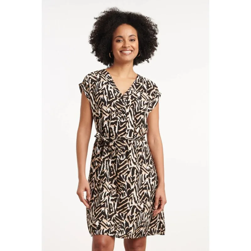 Maak een stijlvol statement met deze korte jurk van Smashed Lemon, ontworpen met een trendy abstracte dierenprint in zwart en zandkleur. De jurk heeft een flatterende V-halslijn en korte aangeknipte mouwen, wat zorgt voor een casual-chique uitstraling. Met een ceintuur en lusjes in de taille kun je je silhouet mooi accentueren, waardoor deze jurk zowel comfortabel als elegant is. Perfect voor elke gelegenheid, van een casual dag tot een avondje uit, straalt deze jurk zelfvertrouwen en stijl uit. Voeg deze veelzijdige must-have toe aan je collectie voor een tijdloze look. Kenmerken: - V-halslijn en korte aangeknipte mouwen voor een moderne, stijlvolle look - Abstracte dierenprint in zwart en zand voor een opvallende, trendy uitstraling - Ceintuur met lusjes in de taille voor een vrouwelijk, getailleerd silhouetSpecificaties : * Stijl: jurken * Print: Dierenprint * Pasvorm: Losvallend * Lengte: Boven de knie * Model: 180 cm lang en draagt maat S/147 * Production country: