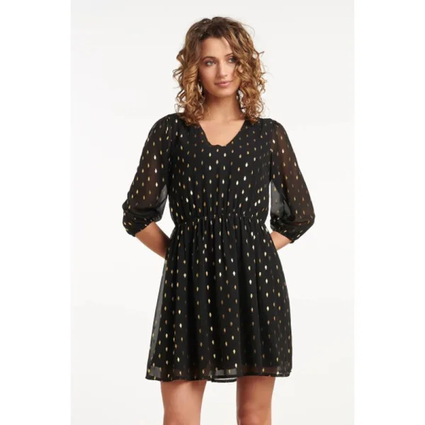 Voeg een vleugje luxe toe aan je garderobe met deze elegante korte jurk van Smashed Lemon. De jurk is ontworpen met een flatterende V-halslijn en driekwart mouwen, die perfect zijn voor verschillende seizoenen. De prachtige gouden stippenprint op een zwarte chiffon ondergrond geeft de jurk een chique en verfijnde uitstraling. De elastische taille accentueert je figuur, terwijl het elastiek onderaan de mouwen een speelse en comfortabele afwerking biedt. Deze jurk is perfect voor zowel een avondje uit als een zakelijke gelegenheid, waarbij stijl en comfort hand in hand gaan. Kenmerken: - V-halslijn en driekwart mouwen voor een stijlvolle, verfijnde uitstraling - Gouden stippenprint op een zwarte chiffon ondergrond voor een luxe look - Elastische taille en elastiek onderaan de mouwen voor extra comfort en een getailleerde pasvormSpecificaties : * Stijl: jurken * Print: Stippen * Pasvorm: Getailleerd * Lengte: Boven de knie * Model: 180 cm lang en draagt maat S/154 *