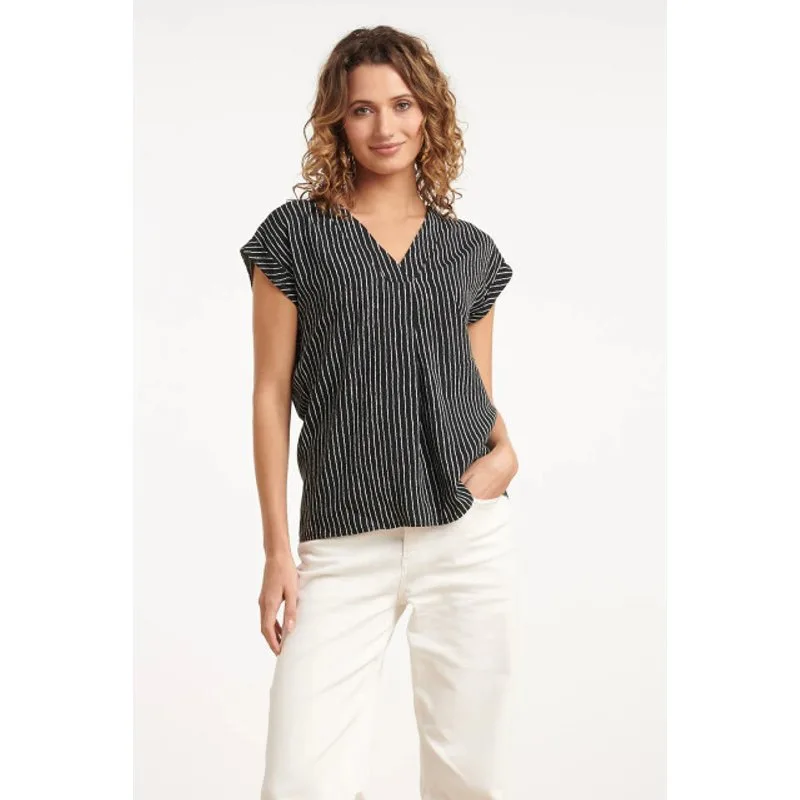 Voeg een gedurfde touch toe aan je dagelijkse stijl met deze top van Smashed Lemon. Gemaakt in een tijdloze zwarte kleur en gedecoreerd met een opvallende witte streep, biedt deze top zowel een modieuze als veelzijdige uitstraling. De top is ontworpen met een V-halslijn en korte aangeknipte mouwen, waardoor hij zowel comfortabel als elegant is. Of je nu een casual look zoekt of een chique outfit voor een avondje uit, deze top past perfect bij elke gelegenheid. Het is een must-have voor de modebewuste vrouw die haar garderobe wil upgraden met een stijlvolle, eigentijdse top. Kenmerken: - V-halslijn en korte aangeknipte mouwen voor een stijlvolle, vrouwelijke uitstraling - Zwart met witte streep print voor een gedurfde, modieuze look - Geschikt voor zowel casual als chique outfitsSpecificaties : * Stijl: tops * Print: Streep * Pasvorm: Losvallend * Lengte: Kort * Model: 180 cm lang en draagt maat S/94 * Production country: Made in P.R.C. * Kleur: Zwart, Wit * Lining: no